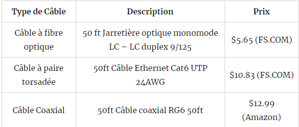 Dans ce tableau, nous pouvons voir que le prix du câble à fibre optique est le plus bas avec la même longueur. Cependant, le prix de l'installation totale de câbles à fibres optiques peut également être élevé en raison de l'usage d'autres composants optiques, notamment des émetteurs-récepteurs optiques. De plus, les câbles à paire torsadée avec connecteur RJ45 coûtent moins cher que les câbles coaxiaux avec un connecteur BNC.
