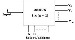 Le démultiplexeur est un circuit logique combinatoire qui effectue l'opération inverse du multiplexeur. Il a seulement une entrée, n sélecteurs et 2n sorties. Selon la combinaison des lignes de sélection, l'une des sorties sera sélectionnée à l'état de l'entrée. Le démultiplexeur convertit un signal de données à l'entrée en une donnée parallèle dans sa ligne de sortie, comme indiqué ci-dessous.