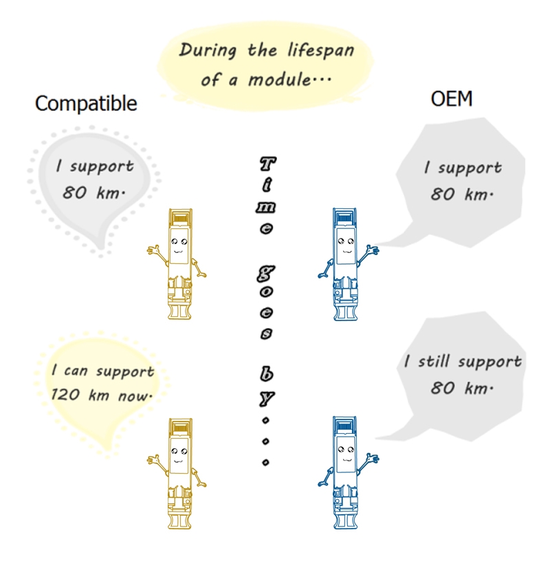 Le fait est que les fabricants du module optique en général ne produisent pas des modules spéciaux pour les OEM. Ils fabriquent au contraire des produits standard basés sur les normes MSA (Multi-Source Agreement), IEEE et les directive de l'UE. Ces normes et directives aux modules ODM sont ce que la loi est pour l'homme. Si les modules sont identiques, pourquoi les modules OEM sont beaucoup plus chers que les modules compatibles ?