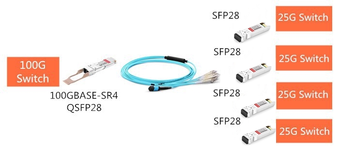 Pour les clients qui ont besoin d'une mise à niveau vers 100G à partir de 25G, le module QSFP28 100G fournit également un moyen flexible pour l'expansion de votre réseau. Le module QSFP28 100GBASE-SR4 peut être connecté aux 4 modules SFP28 25GBASE-SR de la même manière qu'un module QSFP+ 40GBASE-SR doit être connecté aux 4 modules SFP+ 10GBASE-SR. Afin de réaliser cette connexion, nous avons simplement besoin d'un cordon de raccordement MPO-LC 12F.