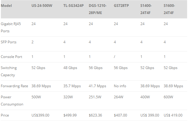 Le tableau ci-dessous résume les performances de ces commutateurs PoE 24 ports et il compare ces prix afin de vous montrer lequel est le plus rentable.