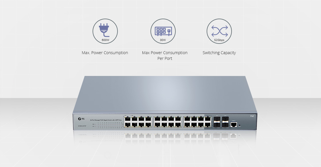 Le S1400-24T4F est un switch PoE 24 ports de FS et le S1600-24T4F est un commutateur PoE+ 24 ports de FS. Les 24 ports RJ45 supportent les connexions PoE (Power over Ethernet) et Ethernet 10/100/1000. Et les ports SFP enfichables à chaud soutiennent les connexions 1 Gbit/s. Les deux articles offrent les services sécuritaires et performants, la gestion centralisée et d'autres fonctions de contrôle du réseau. Il est adapté idéalement au SMB ou à la solution d'entreprise au niveau d'entrée qui nécessite la surveillance, la téléphone IP, la caméra IP, ou des applications sans fil.