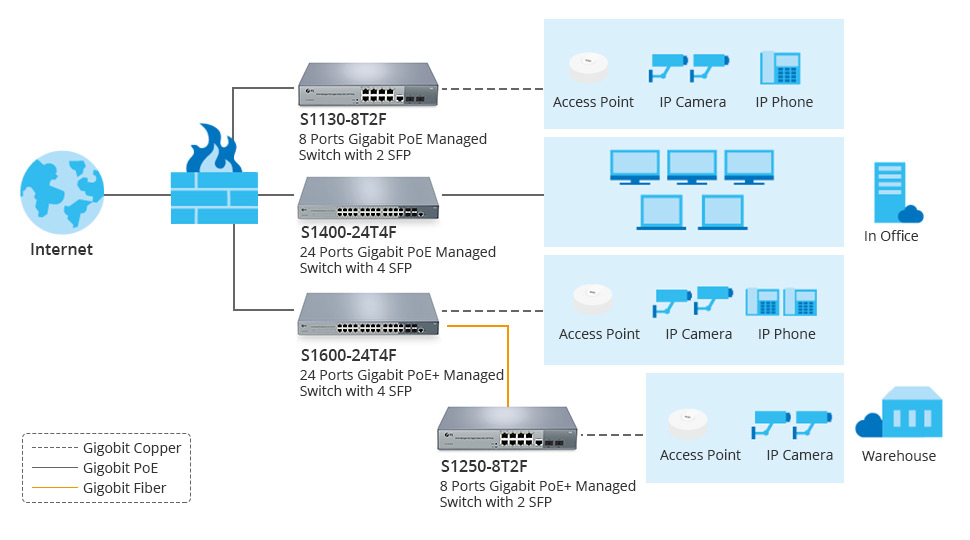 Comme montré dans l'image, les commutateurs PoE 8 ports peuvent être utilisés pour connecter les périphériques alimentés (point d'accès, caméra IP et téléphone IP) via des câbles en cuivre Ethernet, ce qui est très pratique et rentable pour des endroits comme l'entrepôt. Et les commutateurs PoE 24 ports peuvent être utilisés dans les bureaux pour connecter des ordinateurs de bureau ou portables. En outre, en utilisant l'interface de la console de gestion, un administrateur peut contrôler les fonctions PoE différentes, telles que le redémarrage à distance de caméras ou de points d'accès, de n'importe où sur le réseau, y compris sur Internet.
