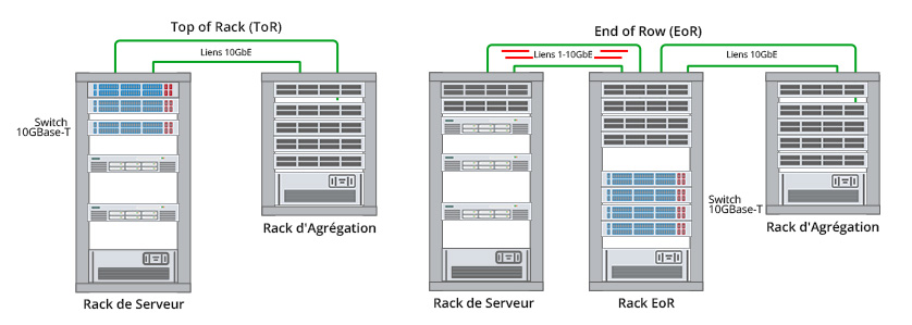 Comme mentionné précédemment, le commutateur FS 10GBase-T peut être utilisé comme commutateur Top Rack (ToR) ou fin de ligne (EoR) ou feuille dans un environnement de centre de données. Voyons comment ce commutateur cuivre 10 Gb s'adapte à ces environnements de câblage.