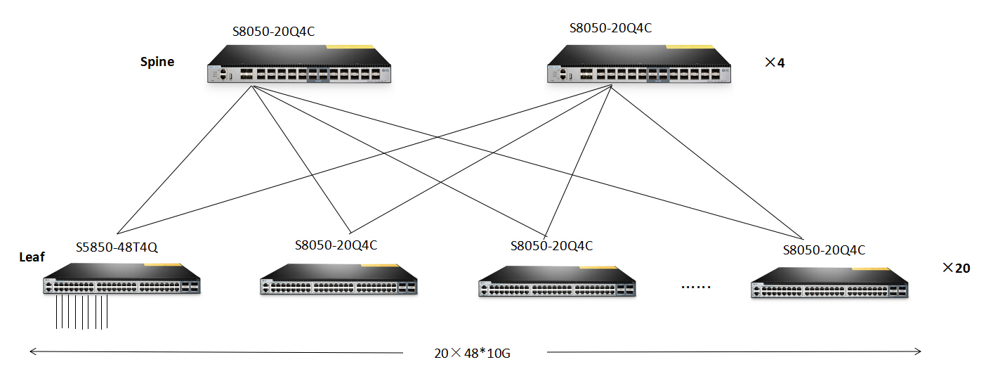 Le commutateur 10GBASE-T S5850-48T4Q, qui se comporte comme un commutateur 'feuille, offre plus de flexibilité pour fournir une connectivité aux routeurs, serveurs et backbones 10GbE dans un environnement de centre de données. Ici, nous utilisons le commutateur FS S8050-20Q4C comme commutateur de colonne vertébrale et le commutateur 10Gbase-T S5850-48T4Q comme commutateur de feuille pour démontrer la topologie.